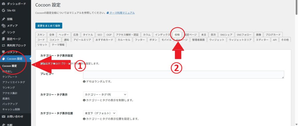 管理画面 → Cocoon設定 → 投稿 をクリック